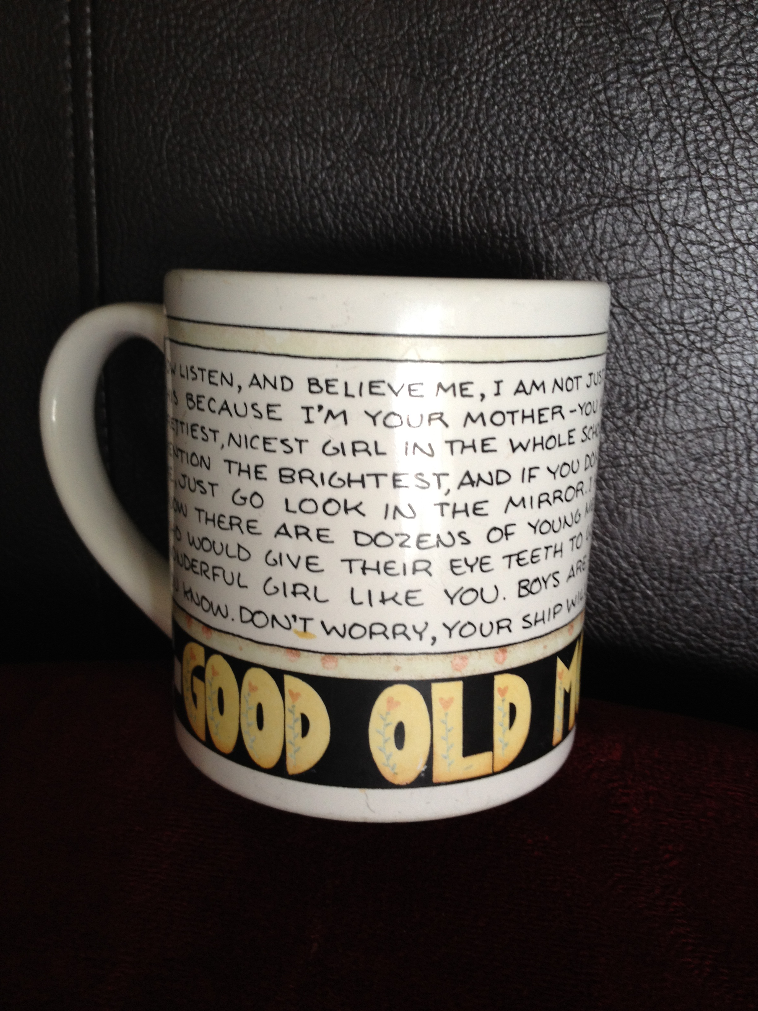 She texted back encouragement in the form of something written on a coffee mug I gave her when I was a teenager. On the mug there’s an image of a mom-caricature, she’s hearty and wearing an apron, wooden spoon in hand like a queenly scepter, chattering on to her unseen daughter. She says, “….now listen to me, I am not just saying this because I am your Mother…you are the smartest, prettiest, nicest girl in the whole world….!”